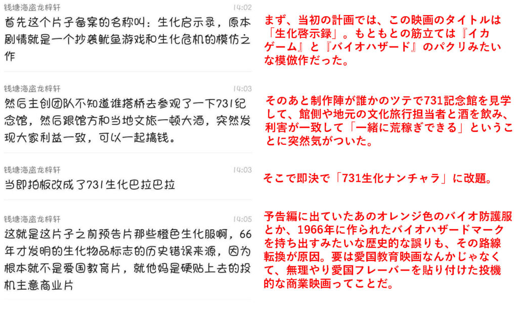 中国で9月18日に公開された旧日本軍の731部隊を題材にした映画「731」が、中国のネットで激しい批判に遭っている。それもそのはず。監督の趙林山氏は本来、731部隊とは全く無関係なアクション・スリラーものである『生化啓示録』を制作しようとしていたようだ。『生化啓示録』はカプコン社の「バイオハザード:リベレーションズ」に類似の物だが、もちろんカプコン社のゲームとは違う別の作品だ。ところが制作スタッフが「731記念館」を参観したところ、「731と関係づけると儲かるんじゃないか」という話が持ち上がり、強引に731部隊にこじつけた映画を制作したのだという。
