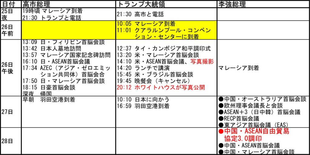 まず黄色に染めた「26日午前中」に注目していただきたい。トランプ大統領が、ASEAN首脳会議が行われるクアラルンプール・コンベンションセンター(会議センター)に到着しているのに、高市総理は午前中動かずにホテルに身を潜め、午後になって16:10に「日本・ASEAN首脳会議」が始まるまで、会議センターには近づかないように工夫されている。なぜなら、そこにはトランプ大統領がいるからだ。