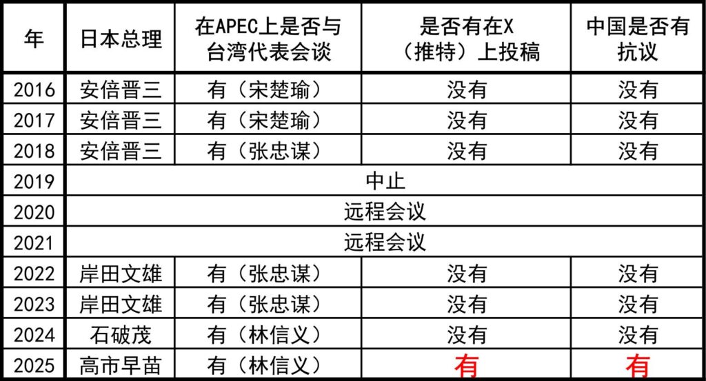 以往的日本首相都曾在APEC会议上与台湾代表会面,但他们都没有通过X或推特等网络平台公开会晤内容。这体现了一种克制 。