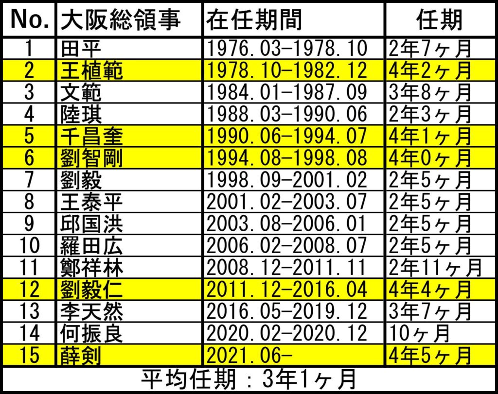 図表1に、これまでの中国の駐大阪総領事の任期を大阪総領事館のデータに基づいてまとめてみた。