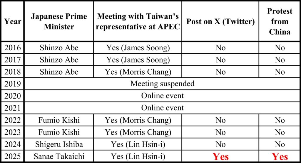 Successive Japanese prime ministers have met with Taiwan’s representative at APEC, but none have ever posted about it online on X (formerly Twitter) or other social media platforms. This reflected a degree of restraint.