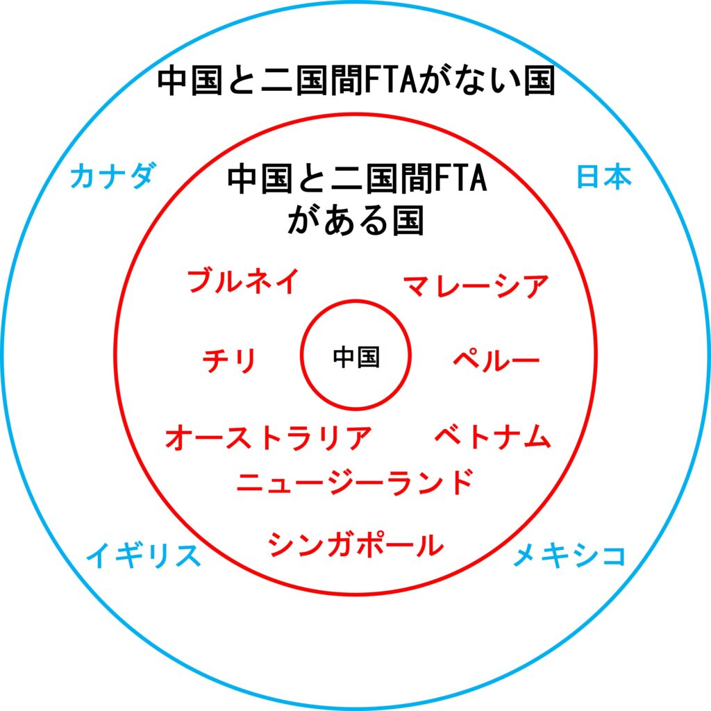 念のため図表2に、「CPTPPの加盟国の中で、中国と二国間FTA(自由貿易協定)あり・なしの国」を、同心円を用いて表してみた。