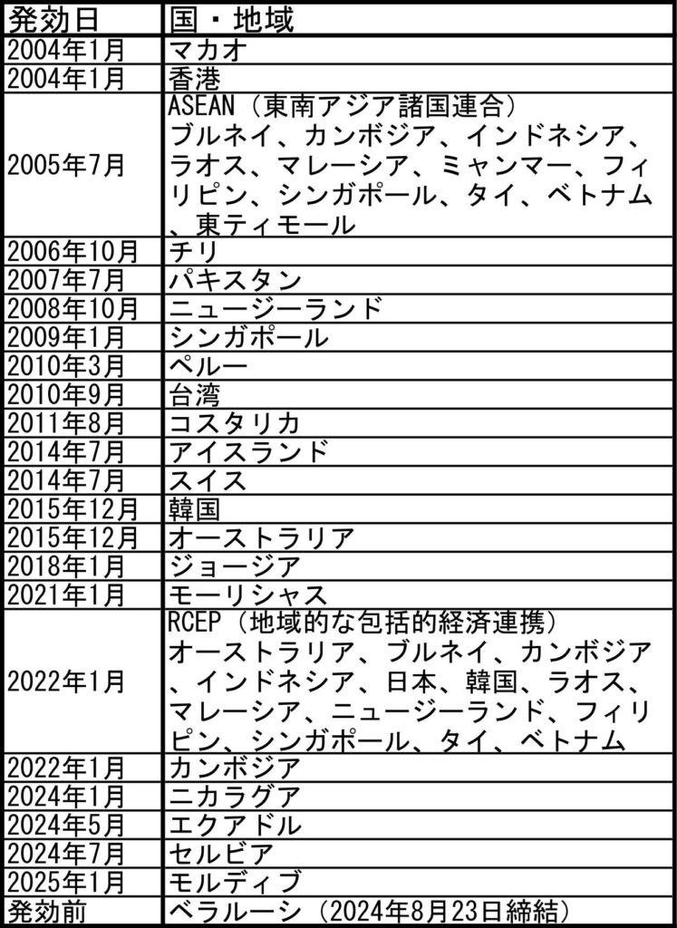 さらに中国はCPTPP以外に多くの国と二国間FTAを締結しているので、それを図表3に表す。