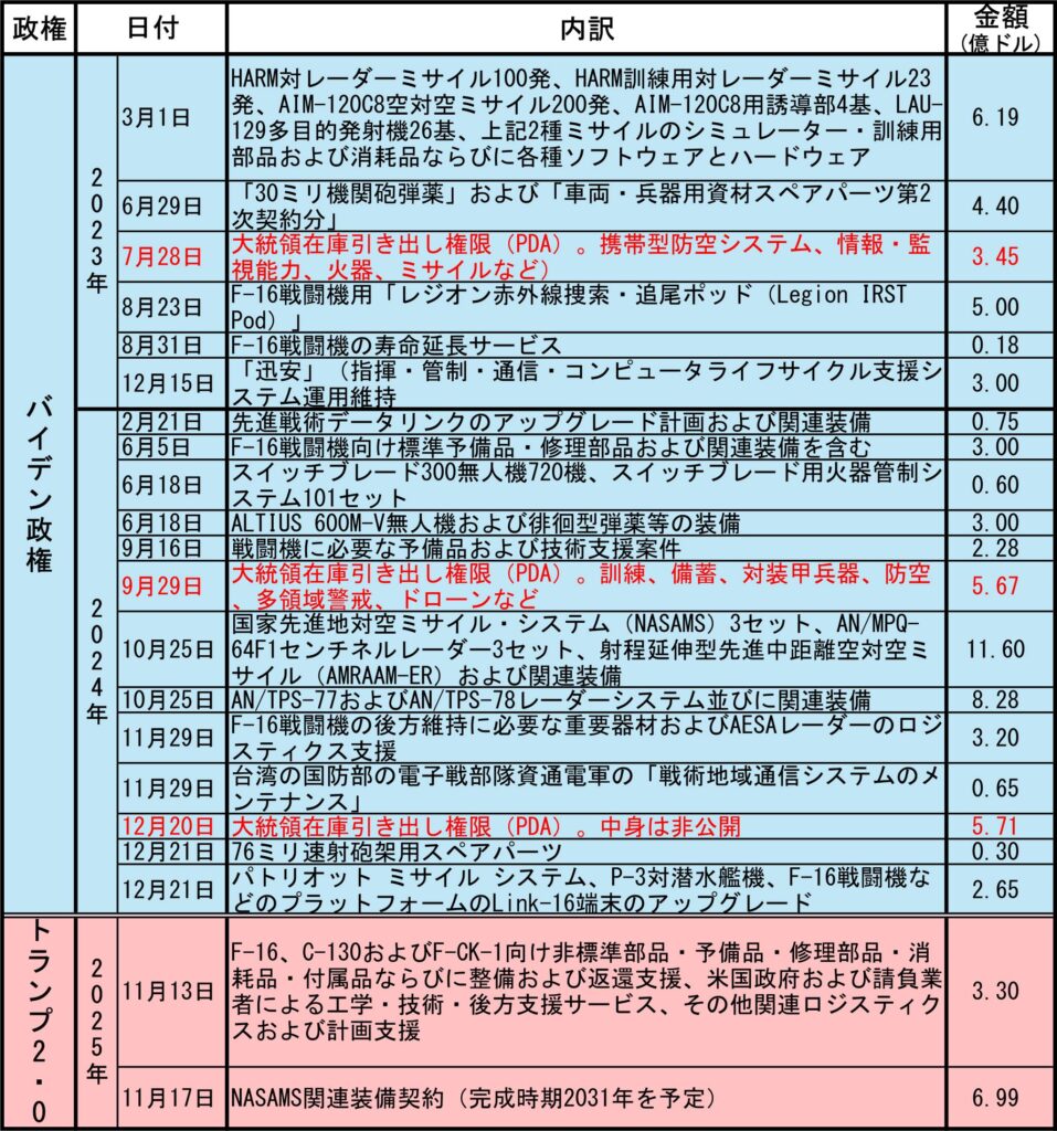 またバイデン政権時代に台湾向けPDA(=TERA)による無償支援や無償提供に関しては、赤文字で示した。無償軍事支援・提供は計3回あり、1回目の内容および2回目の内容に関しては具体的なデータがあるが、3回目の内容に関しては金額があるだけで詳細なデータは非公開になっている。