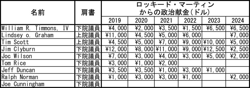 ロッキード・マーティン歴年の政治献金リストに基づいて筆者作成
