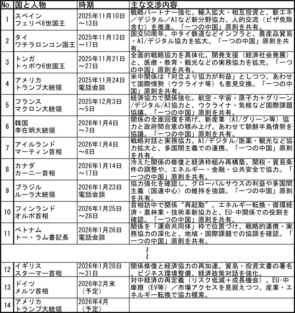 図表:「高市発言」後の諸外国首脳&国王の「北京詣で」(電話会談も含む)