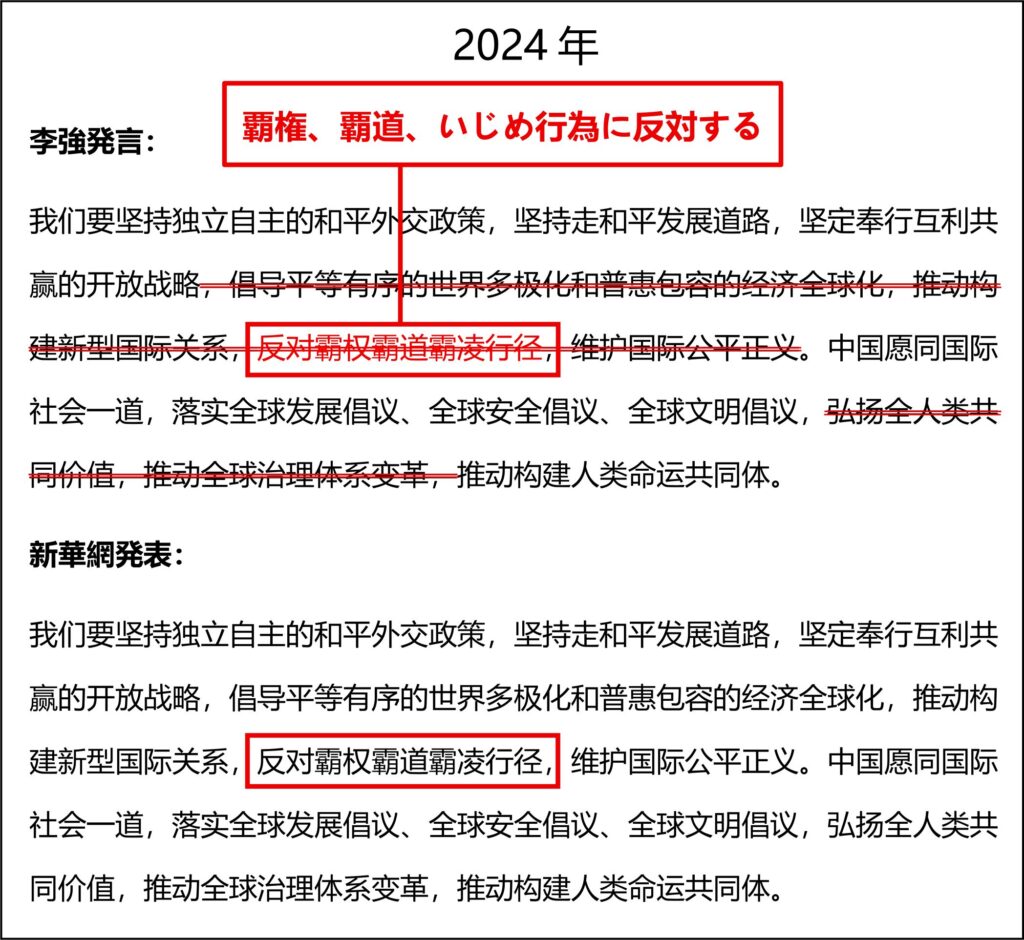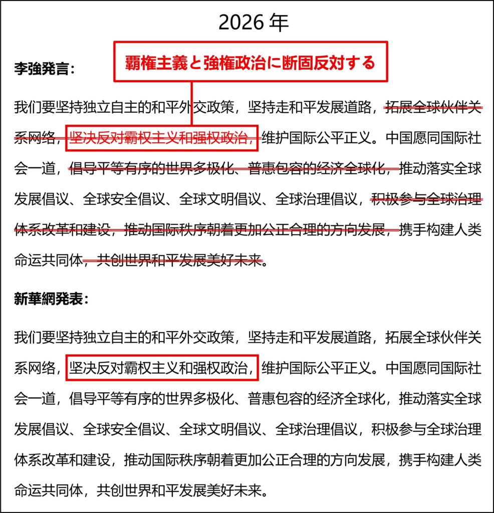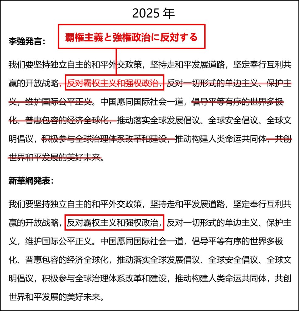 2025年でも政府活動報告の外交関連部分は同じで、2026年とピッタリ同じ文言が文字版(原稿)にはあり、同じ個所を李強は読み飛ばしているのである!