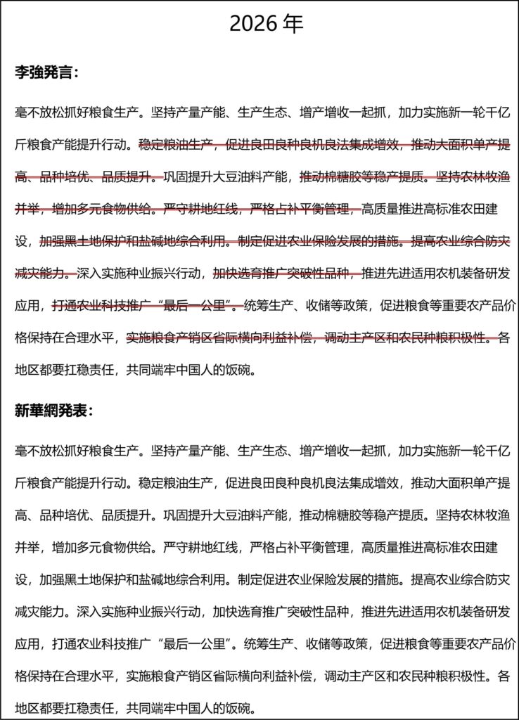 李強の実際のスピーチ生中継はCCTVで確認することができ、本来の文字版(原稿)は新華網で確認することができる。図表4で赤色取り消し線を施した部分は、すべて李強が今年2026年の政府活動報告で読み飛ばした部分である。