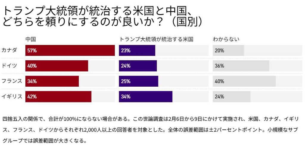 特に、圧倒的にトランプよりも習近平を頼りにできるリーダーとみなし、トランプを頼りにできないとみなしているのがカナダだ。
