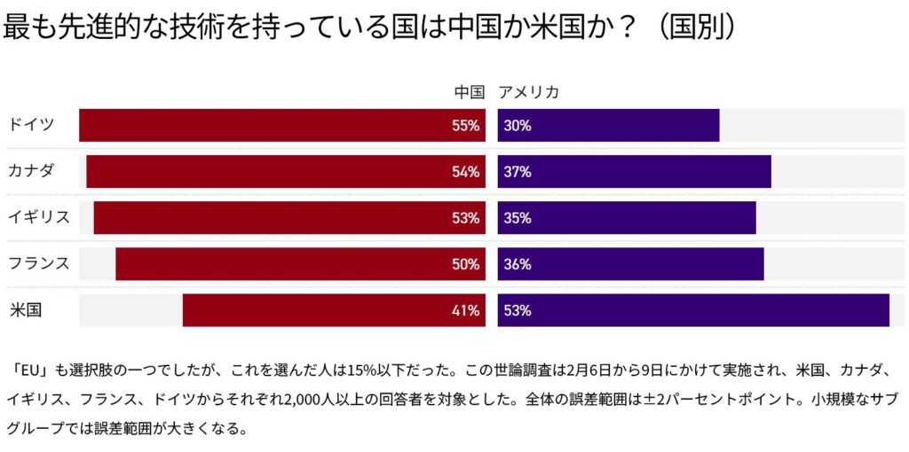 ポリティコの質問の中に「あなたは最も先進的な技術を持っている国は中国だと思いますか、それともアメリカだと思いますか?」というのがある。この質問に対する回答を図表3に示す。