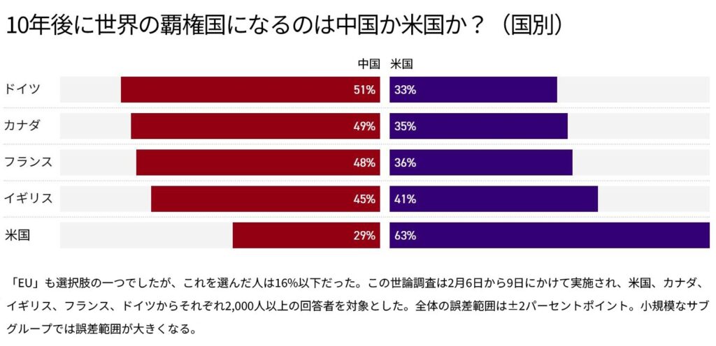 米国はさすがに10年後も自国が世界の覇権国だと思っているが、米国以外の同盟国が全て「10年後には中国が覇権国となる」と考えているというのは、相当に恐ろしい話だ。