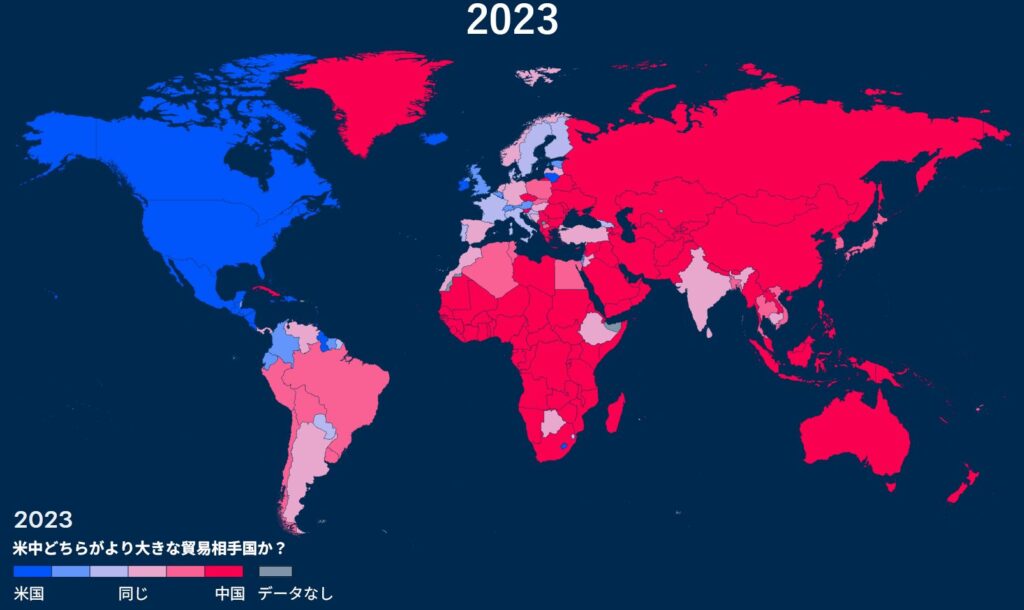 2023年時点ですでに世界各国の最大貿易相手国は中国になっていることが一目でお分かりいただけるだろう。これが年々中国へと傾き、2025年のトランプ関税で一気に中国に傾いていった。新しいデータマップが描かれたら、ほとんどが赤く染まっているにちがいない。この点から見ても調査対象国の多くが(米国自身を除くすべての国が)「10年後の覇権国は中国だ」と言っていることが理解できる。