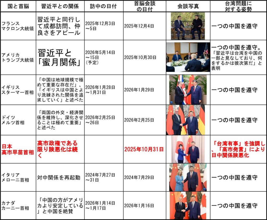 しかし、イタリアも入ってないということは、ひょっとしたらG7のうち、トランプ2.0になってからは、(訪問予定のアメリカを除いて)国賓として中国を訪問した国を対象としているのかという解釈もできる。3月31日にネット公開された動画「ニュースの争点」という番組で【イラン攻撃で中国崩壊は嘘なのか? 習近平の思惑】をテーマに話をさせていただいたが、そこでは図表1を中心に「トランプ2.0になってから中国を国賓として訪問した国あるいは訪問予定の国」を対象としたのではないかという解釈を行なった。