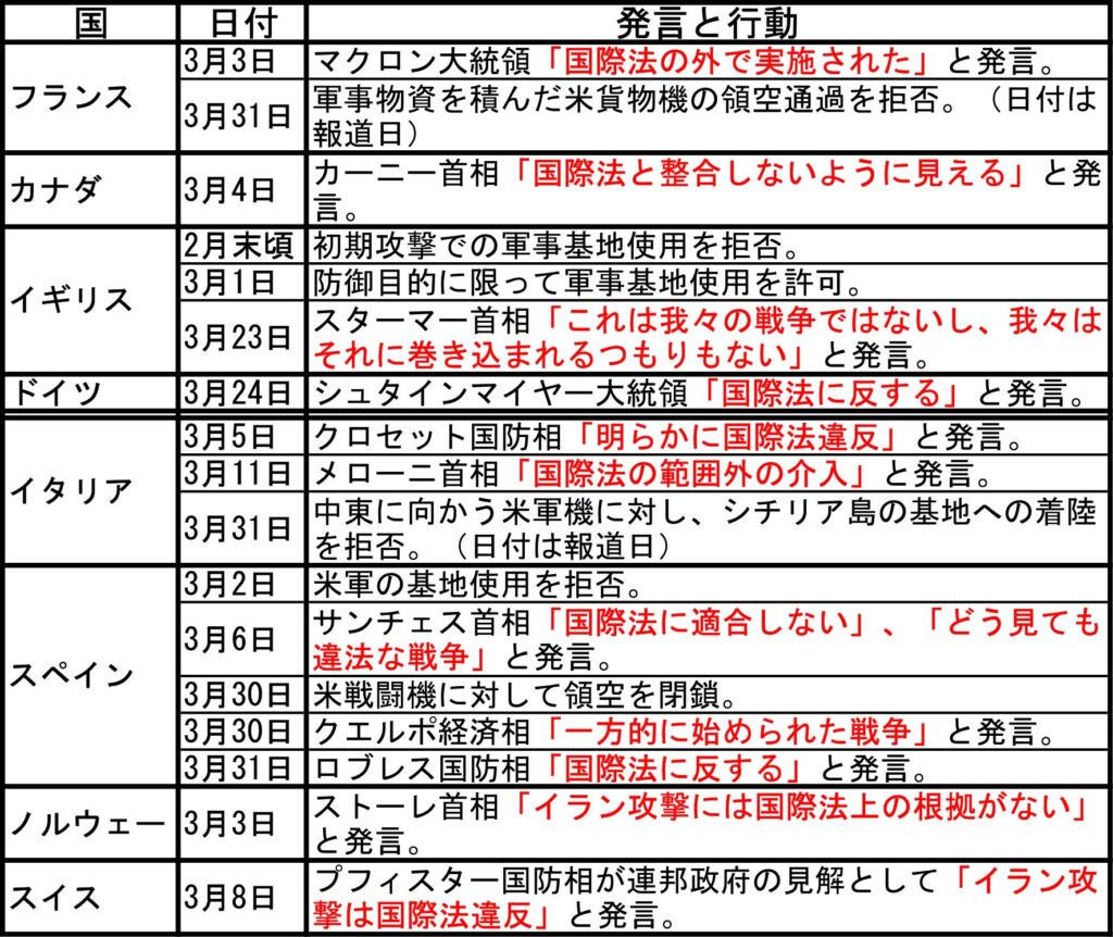 ところが上記のポリティコの世論調査が対象として米国のトップ同盟国らは、早くから「イラン攻撃は国際法に違反している」と明言して、絶対に対米協力は行なわないと宣言している。どの国の誰が、いつ「イラン攻撃反対」を表明したかに関して一覧表を作成してみた。それを図表6に示す。